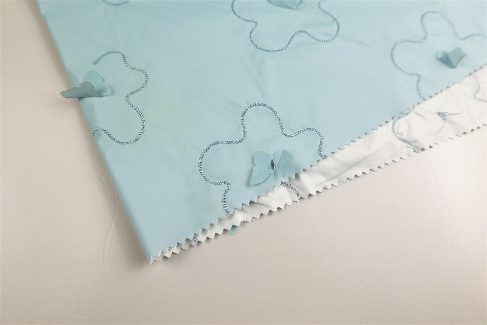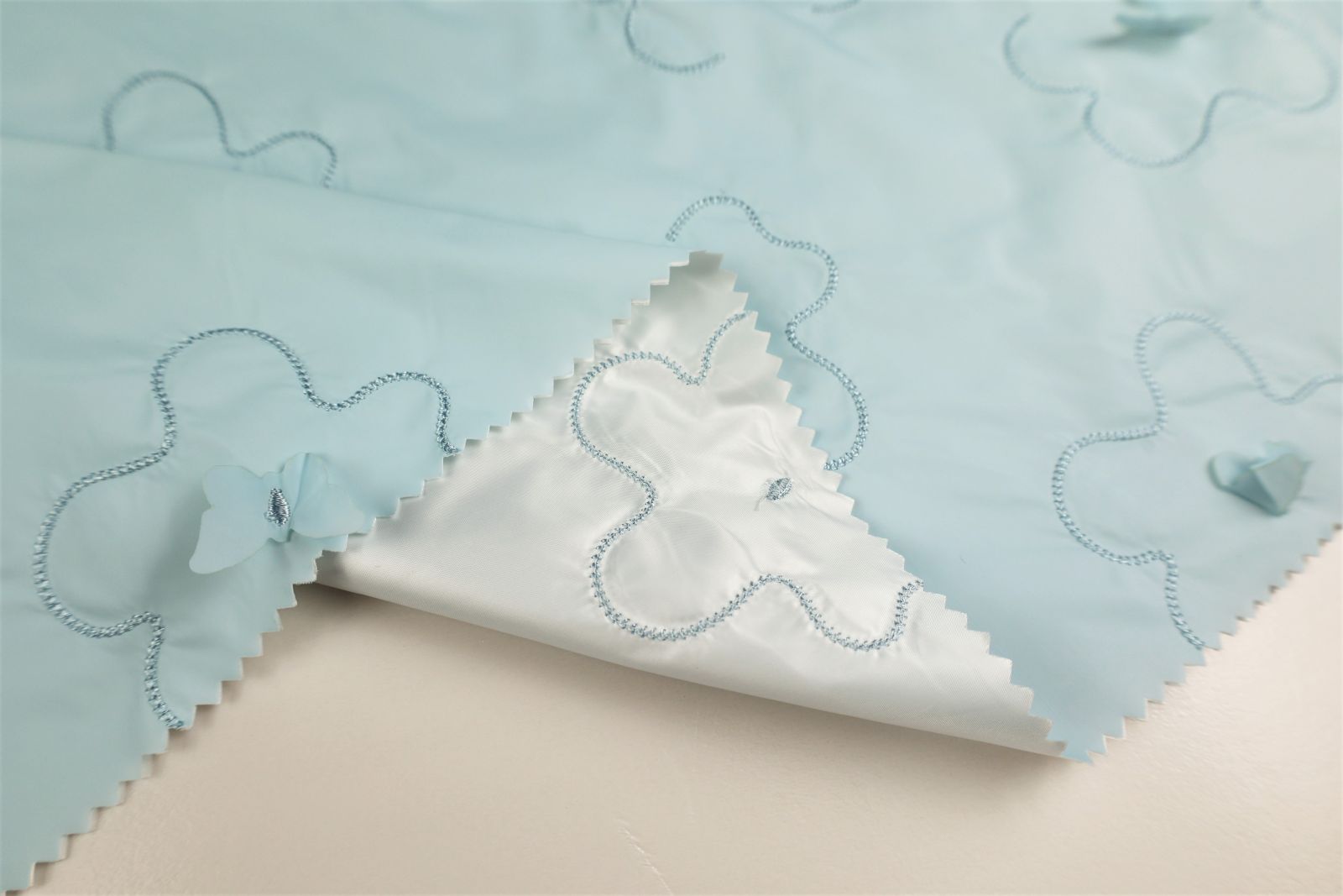 激光繡小花,加持夜光反光的蝴蝶作以點(diǎn)綴,花型立體,使面料賦有生機(jī)。